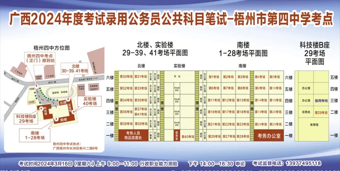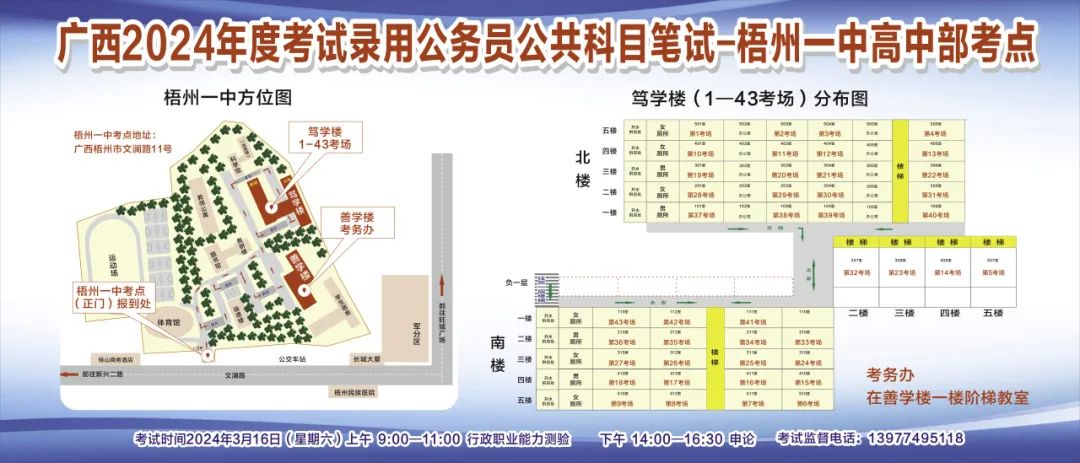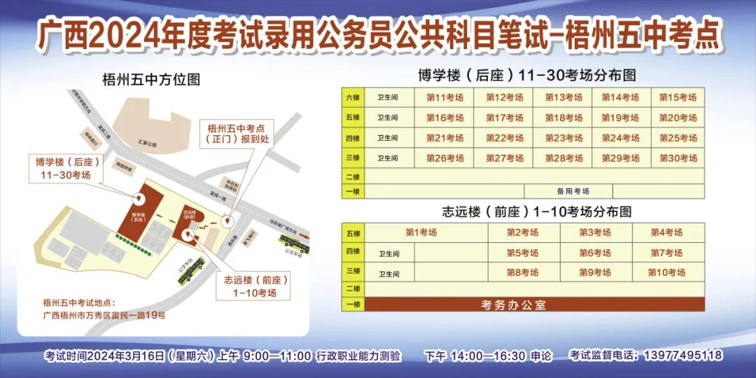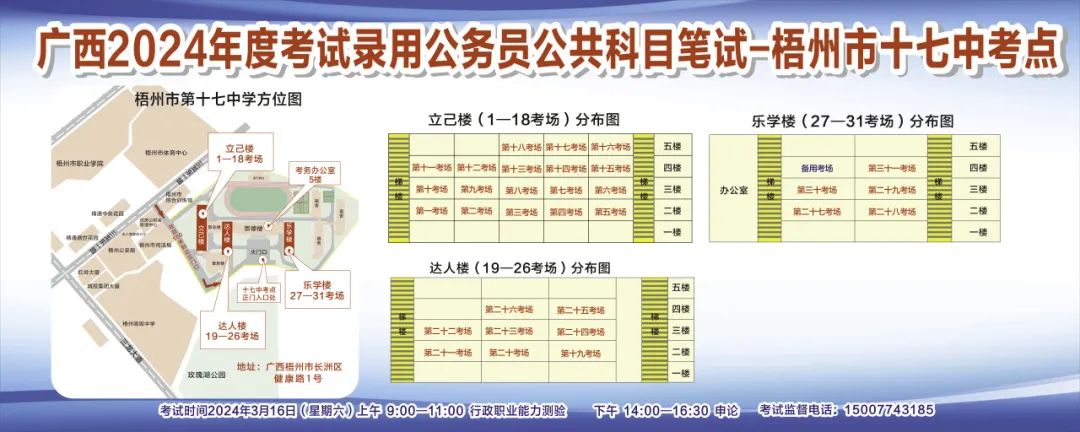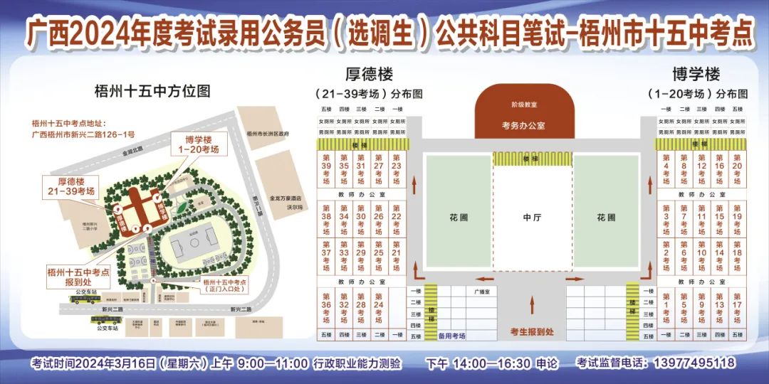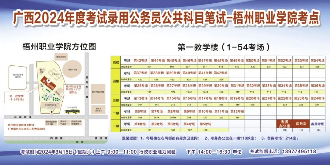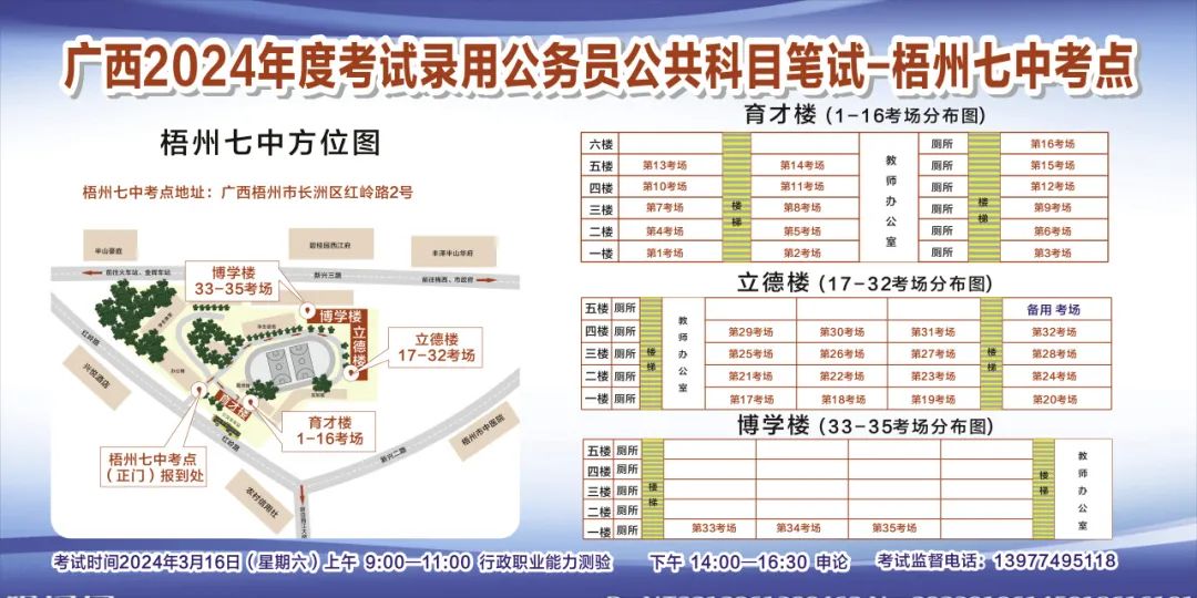 一、廣西2024年度考試錄用公務(wù)員(選調(diào)生)公共科目筆試將于3月16日舉行,梧州考區(qū)共設(shè)置9個考點,請考生提前熟悉各自考點位置、周邊環(huán)境及交通情況,考試當(dāng)天提前出門做好準備,準時參加考試。特別提示:因考點停車場地有限,所有考生車輛不得進入考點,請考生規(guī)劃好前往考點的交通方式和路線。