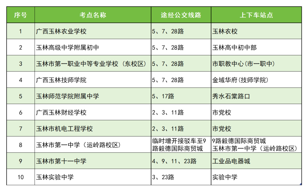 玉林市第一中學(xué)(運(yùn)嶺路校區(qū))考點(diǎn)11:00-11:30,16:30-17:00 在考點(diǎn)安排公交車和值勤人員,負(fù)責(zé)將考生接送到9路毅德國(guó)際商貿(mào)城站點(diǎn)。
