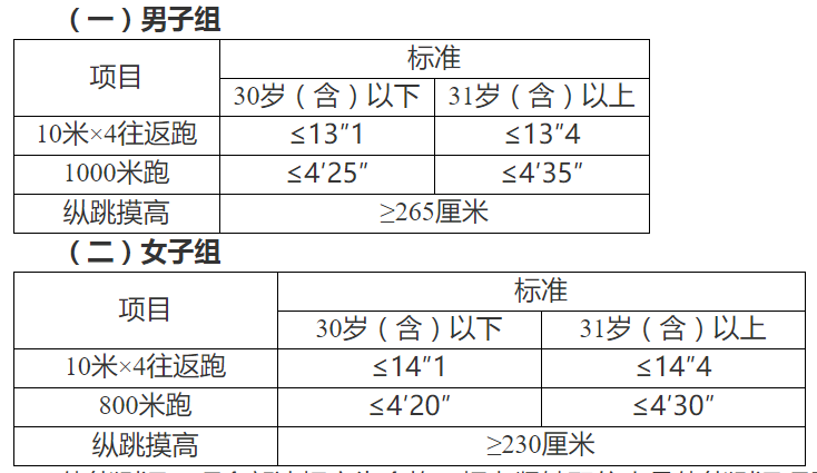 體能測評(píng)三項(xiàng)全部達(dá)標(biāo)方為合格。報(bào)考緊缺職位人員體能測評(píng)項(xiàng)目三項(xiàng)中有兩項(xiàng)達(dá)標(biāo)的,視為合格。體能測評(píng)項(xiàng)目中,縱跳摸高項(xiàng)目的測評(píng)次數(shù)不超過3次,10米×4往返跑項(xiàng)目的測評(píng)次數(shù)不超過2次,男子1000米跑、女子800米跑項(xiàng)目的測評(píng)次數(shù)為1次。