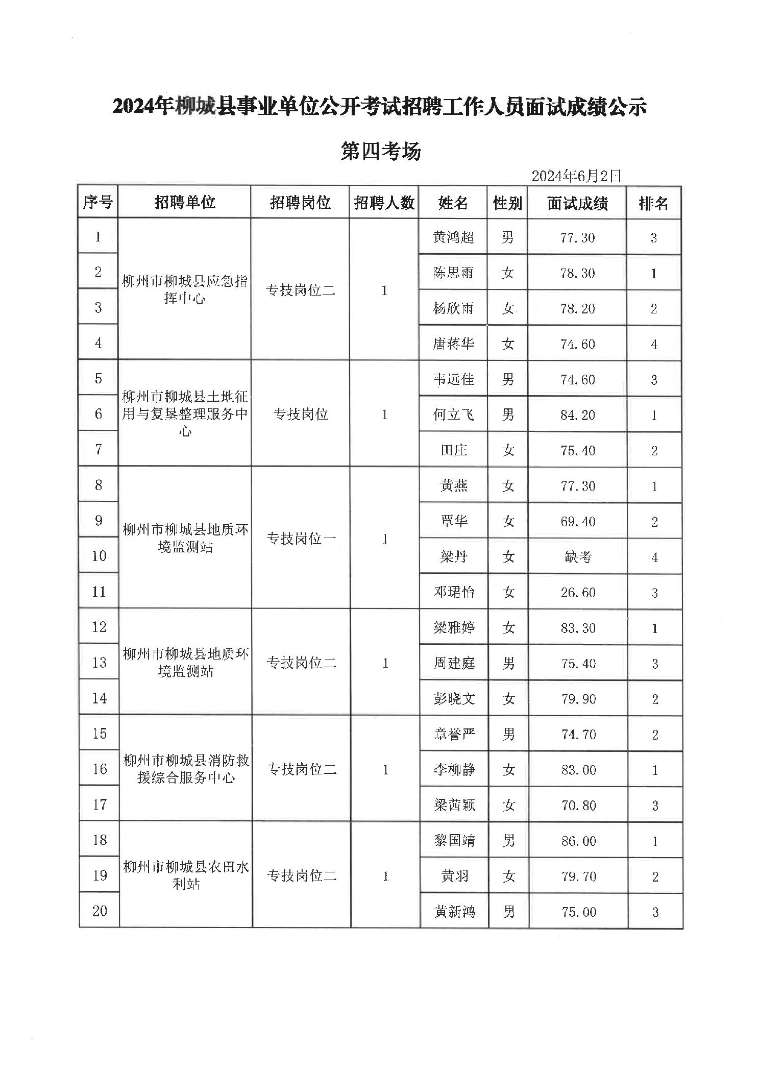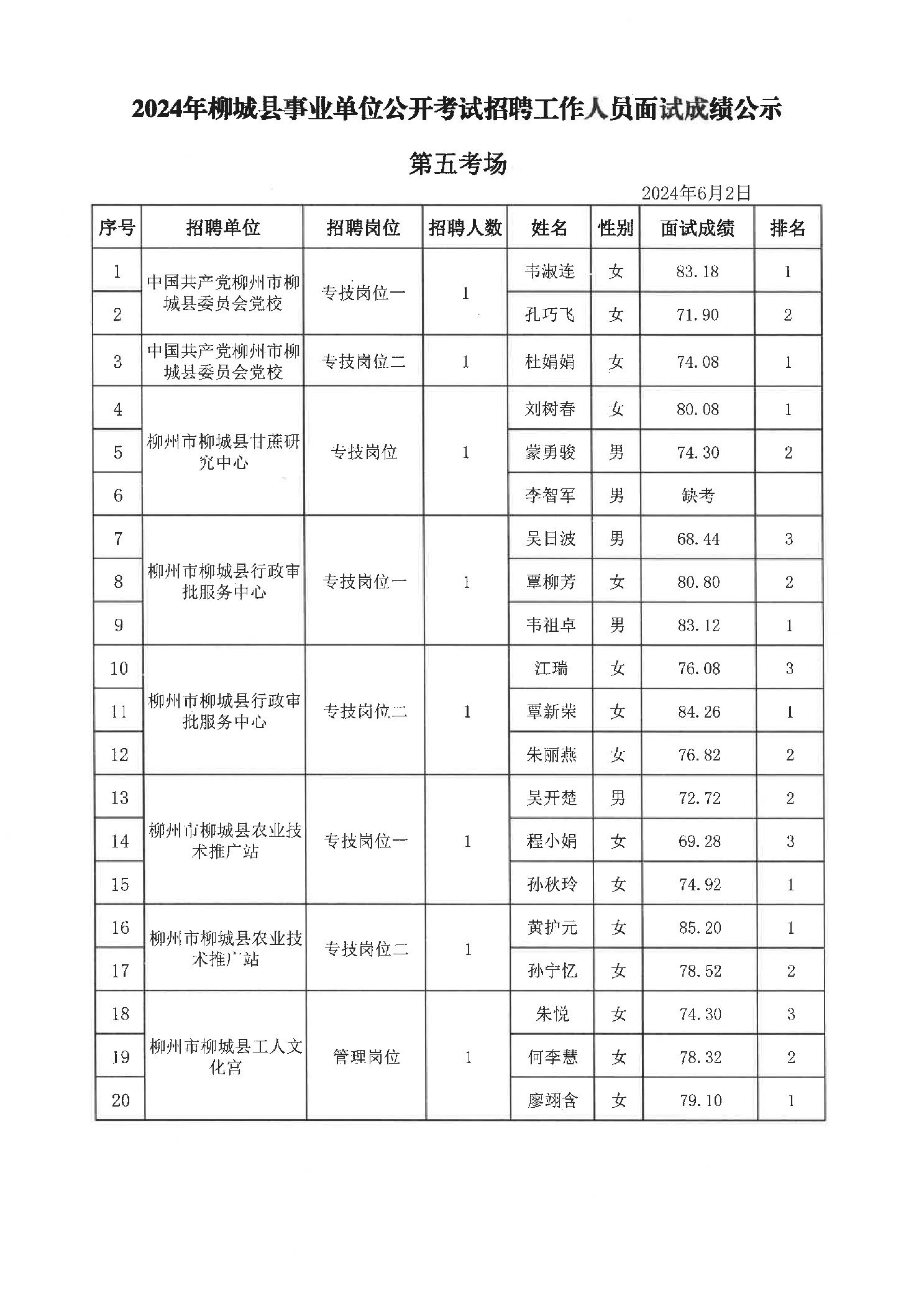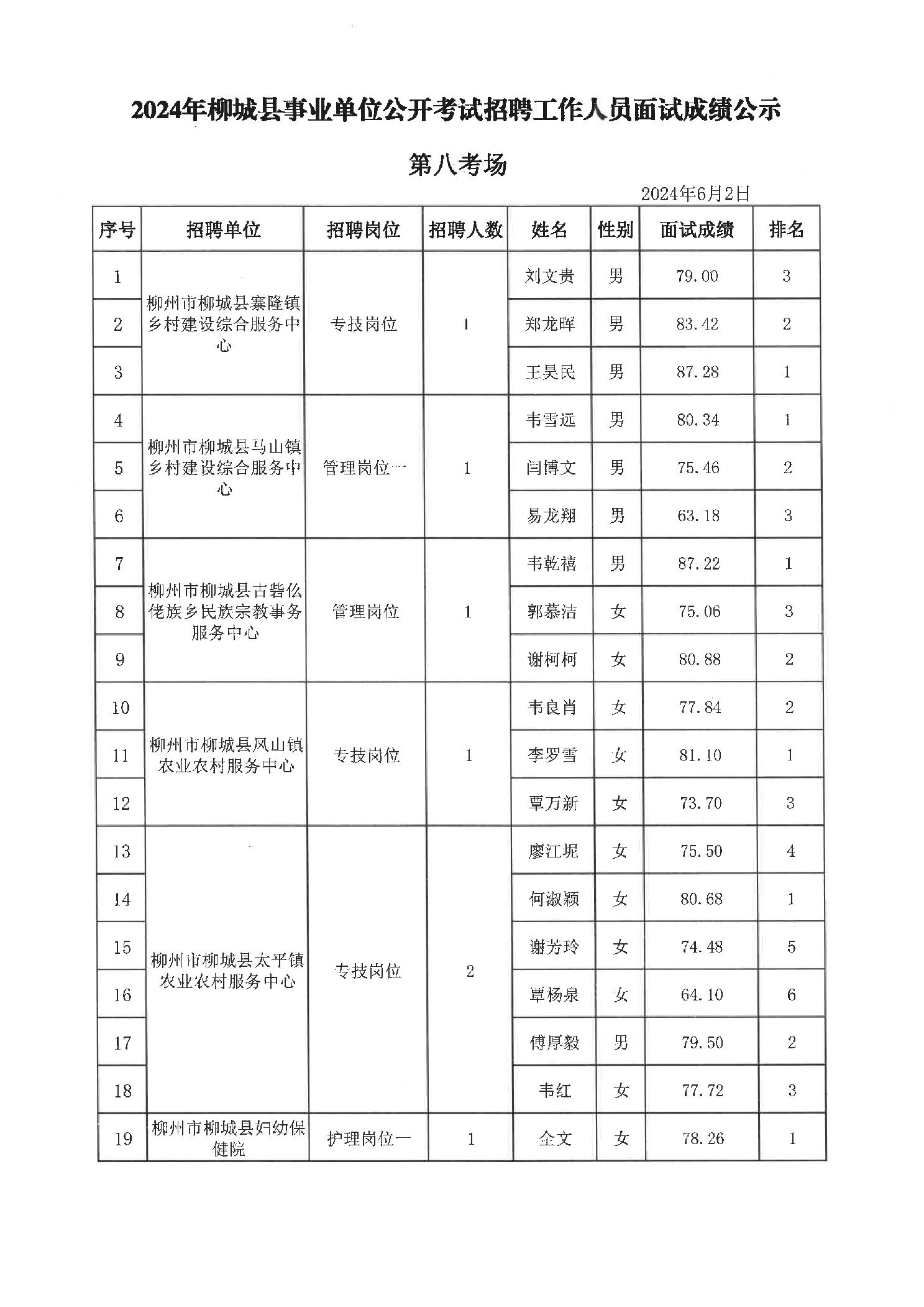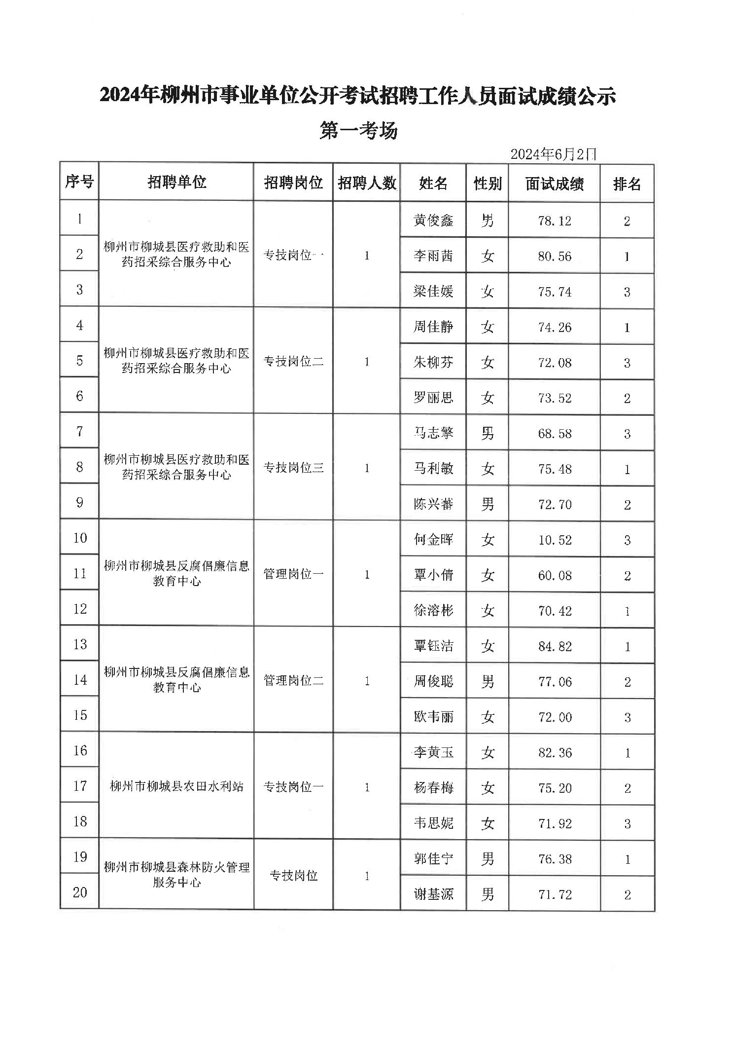 2024年柳城縣事業(yè)單位公開(kāi)考試招聘工作人員面試成績(jī)公示