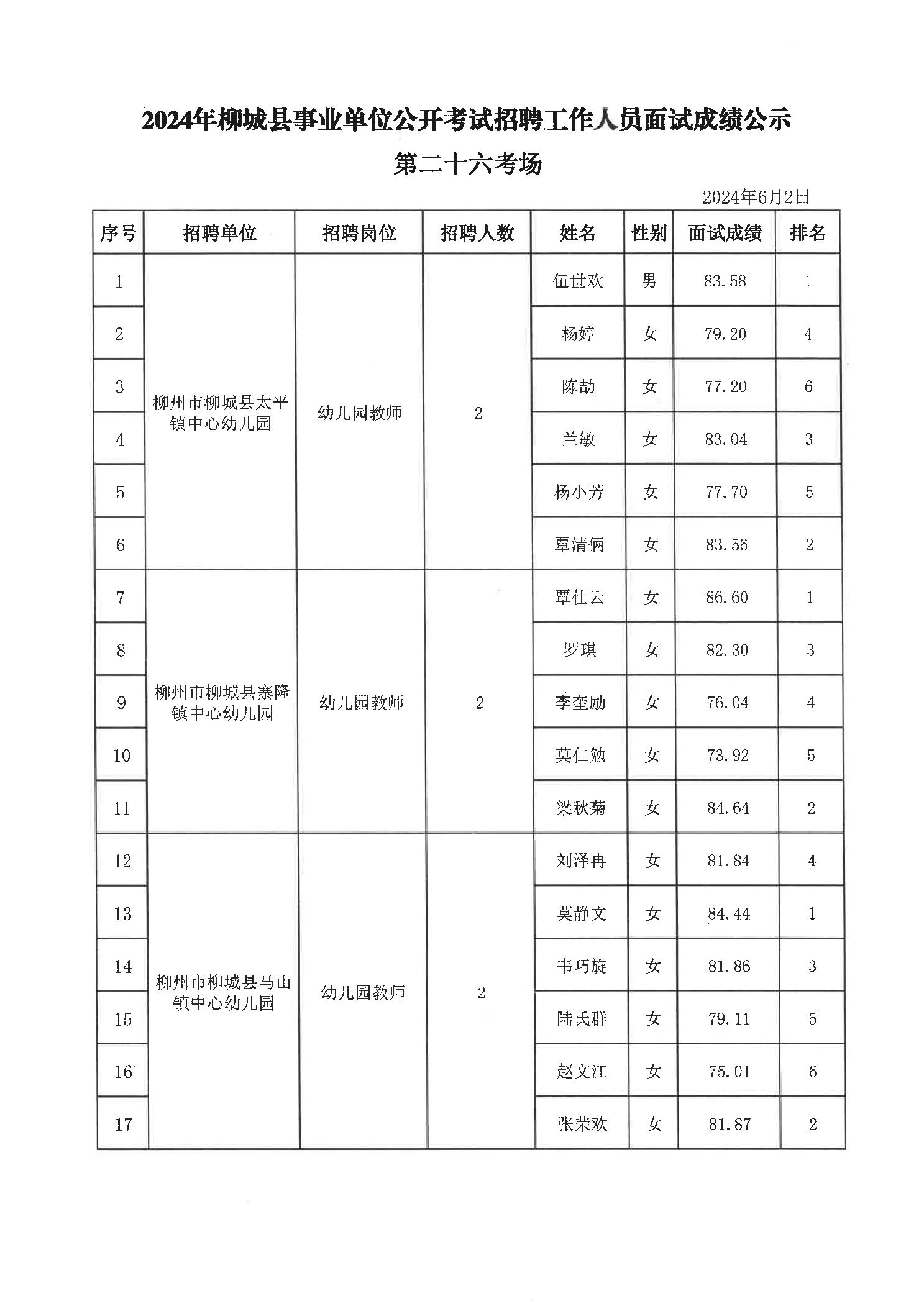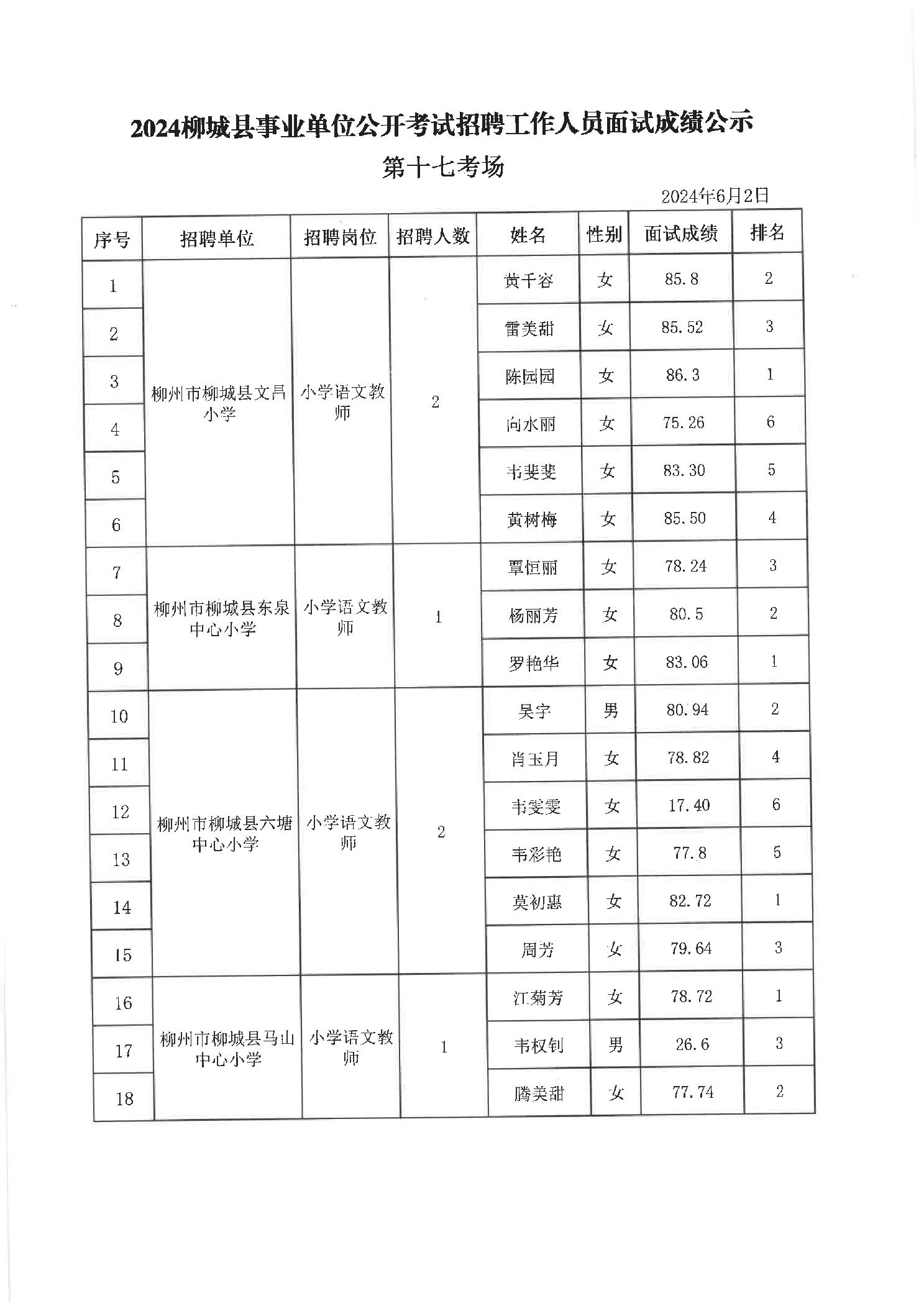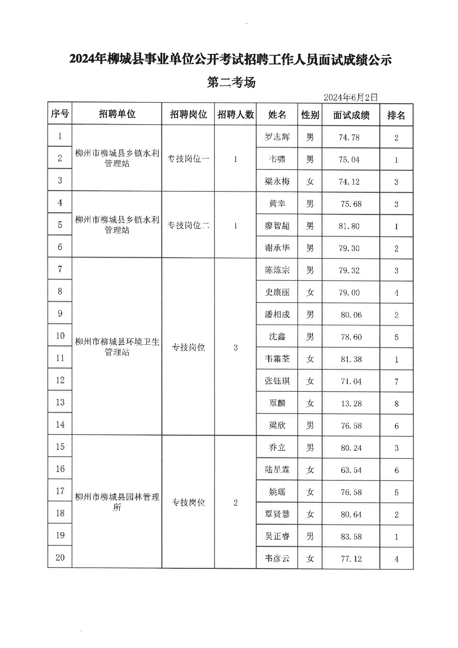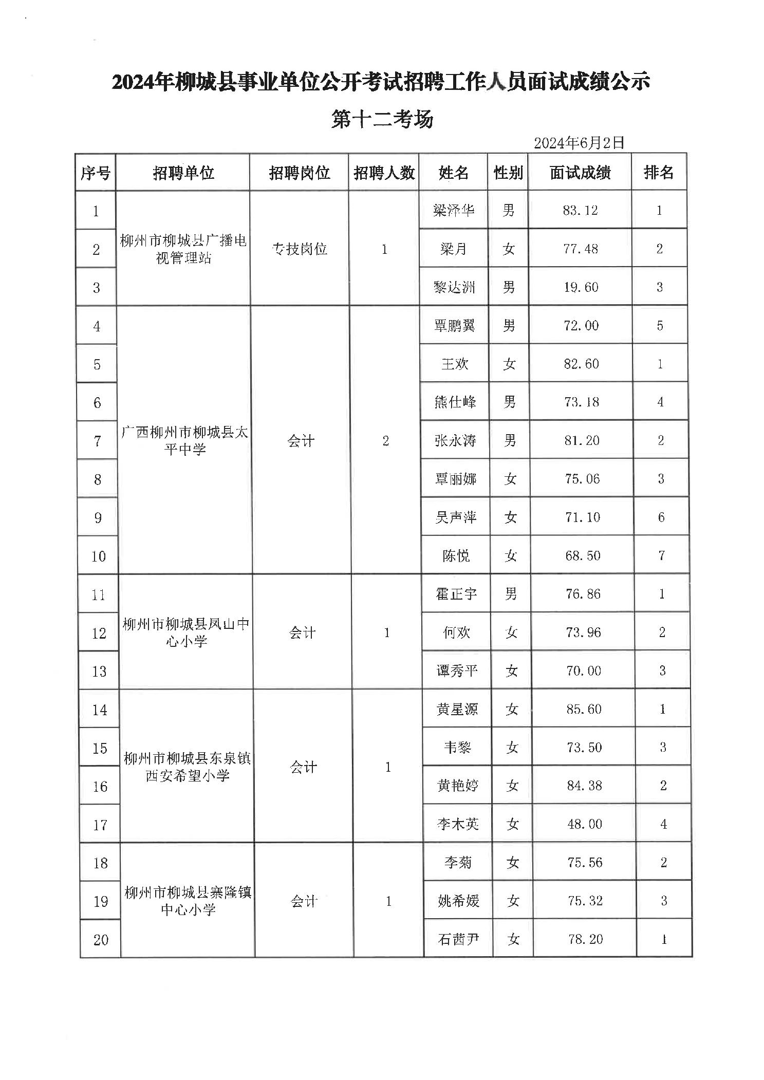 2024年柳城縣事業(yè)單位公開(kāi)考試招聘工作人員面試成績(jī)公示