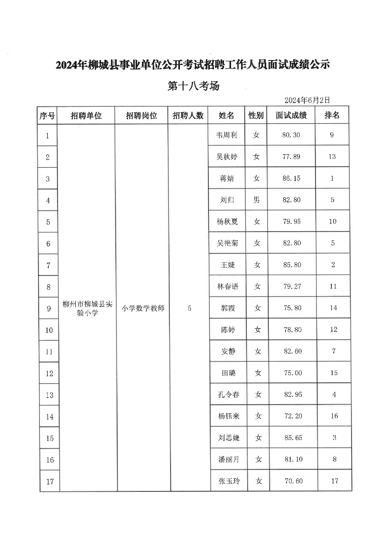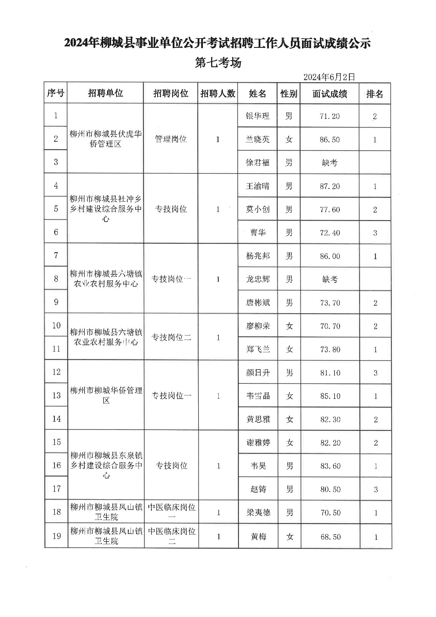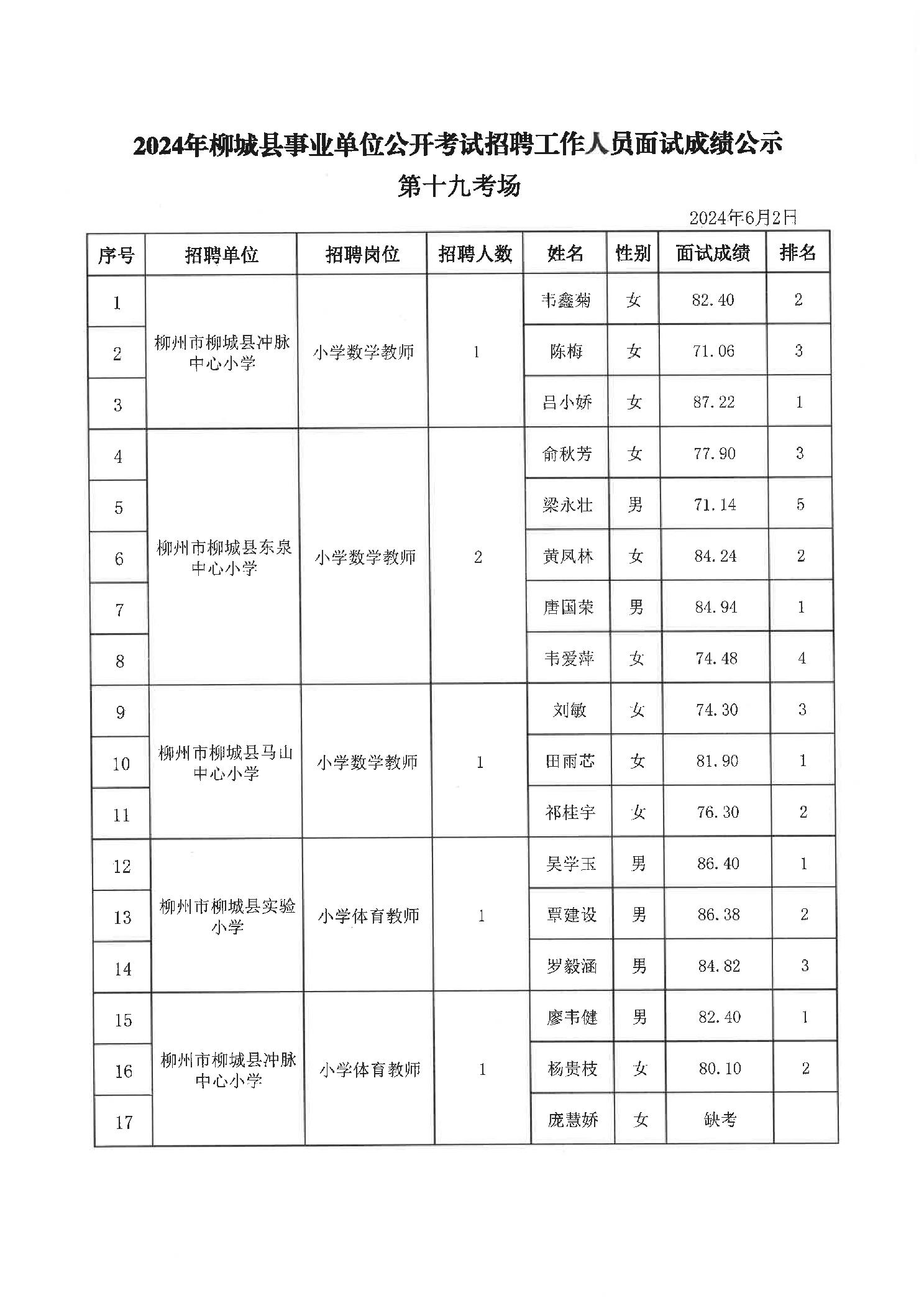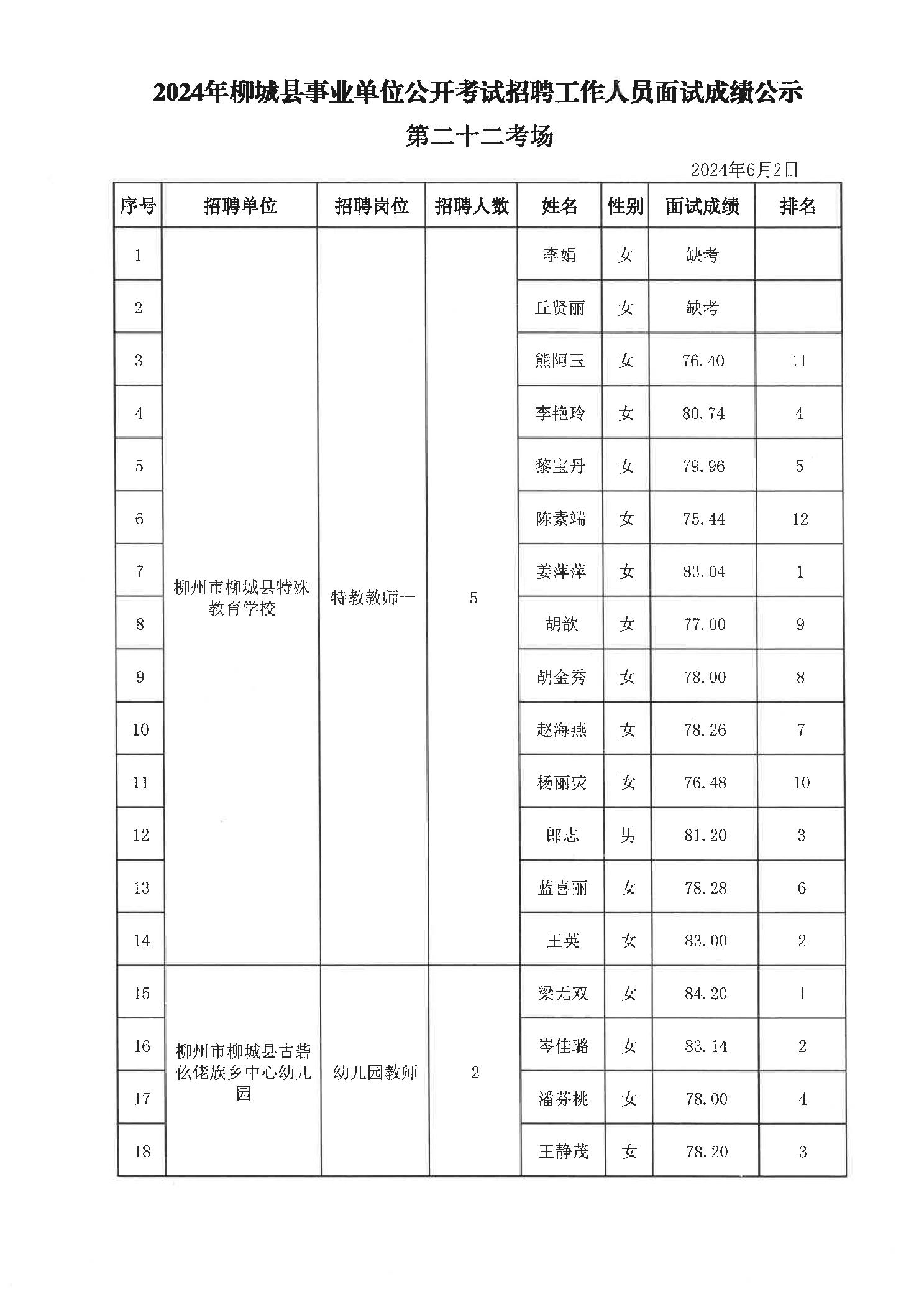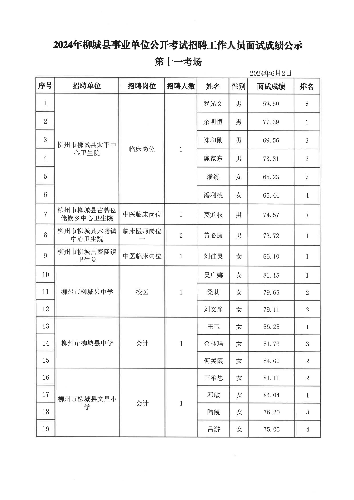 2024年柳城縣事業(yè)單位公開(kāi)考試招聘工作人員面試成績(jī)公示