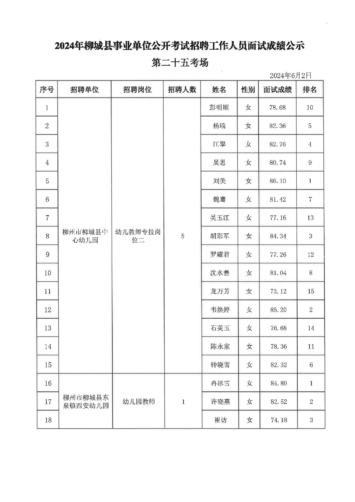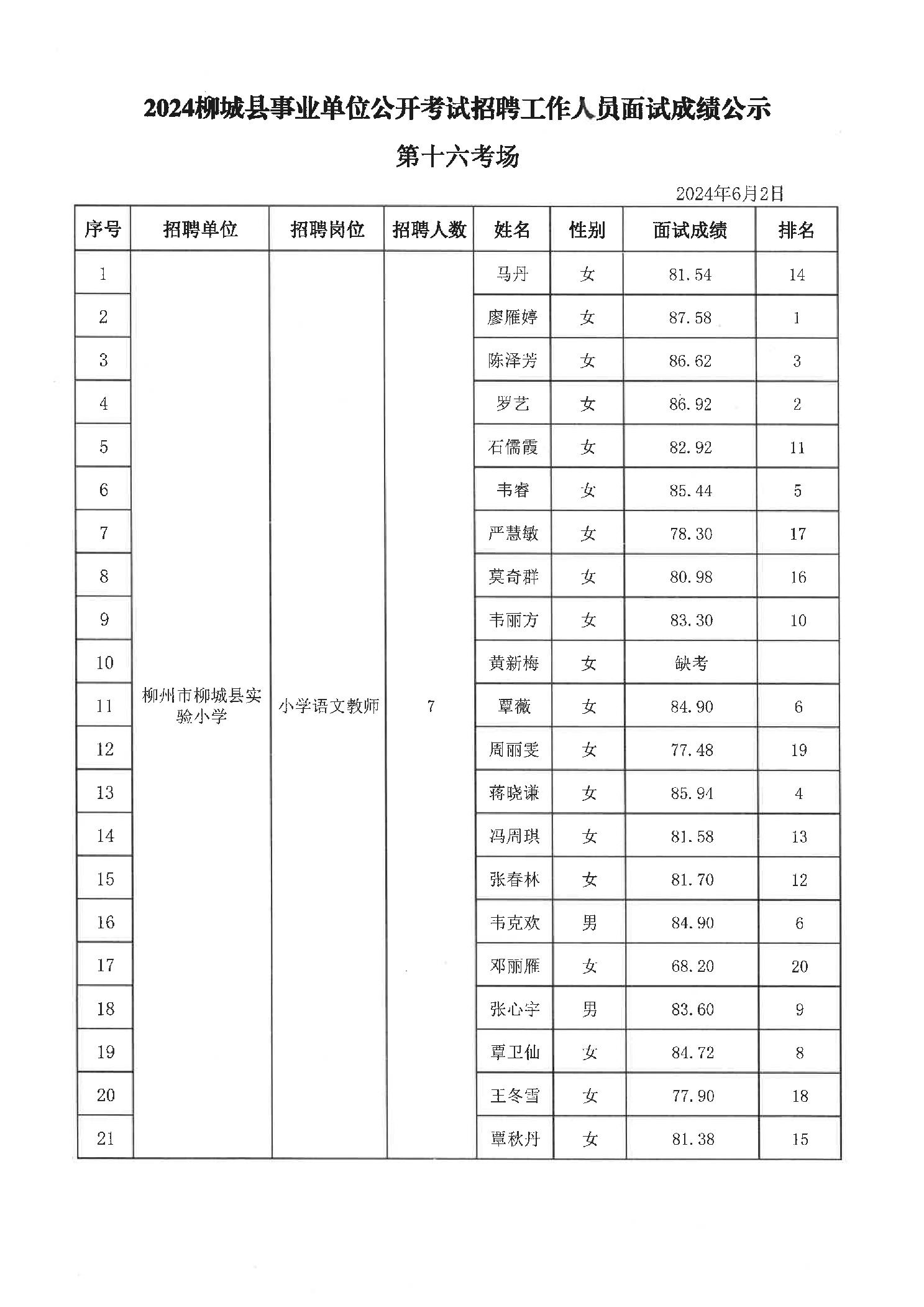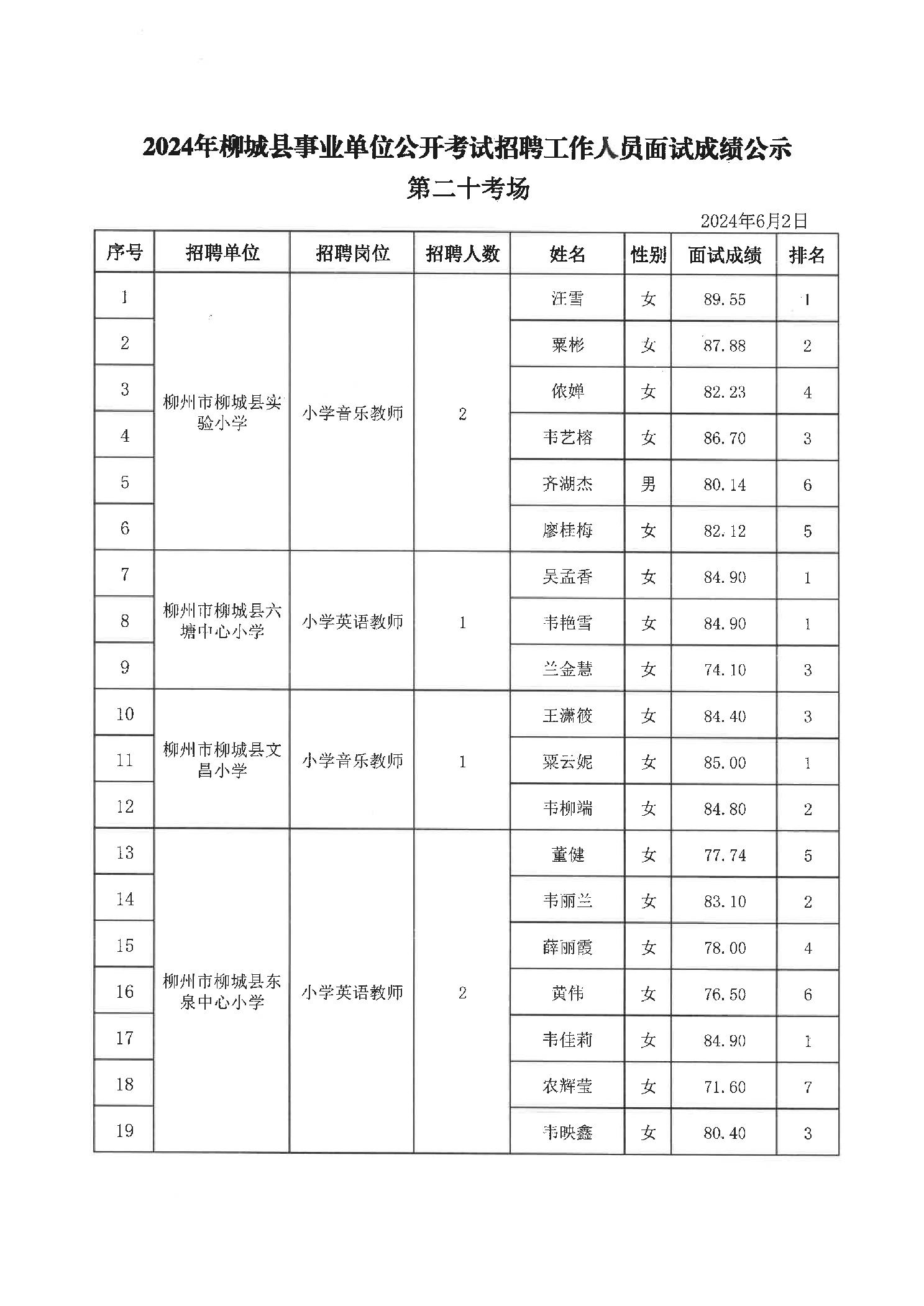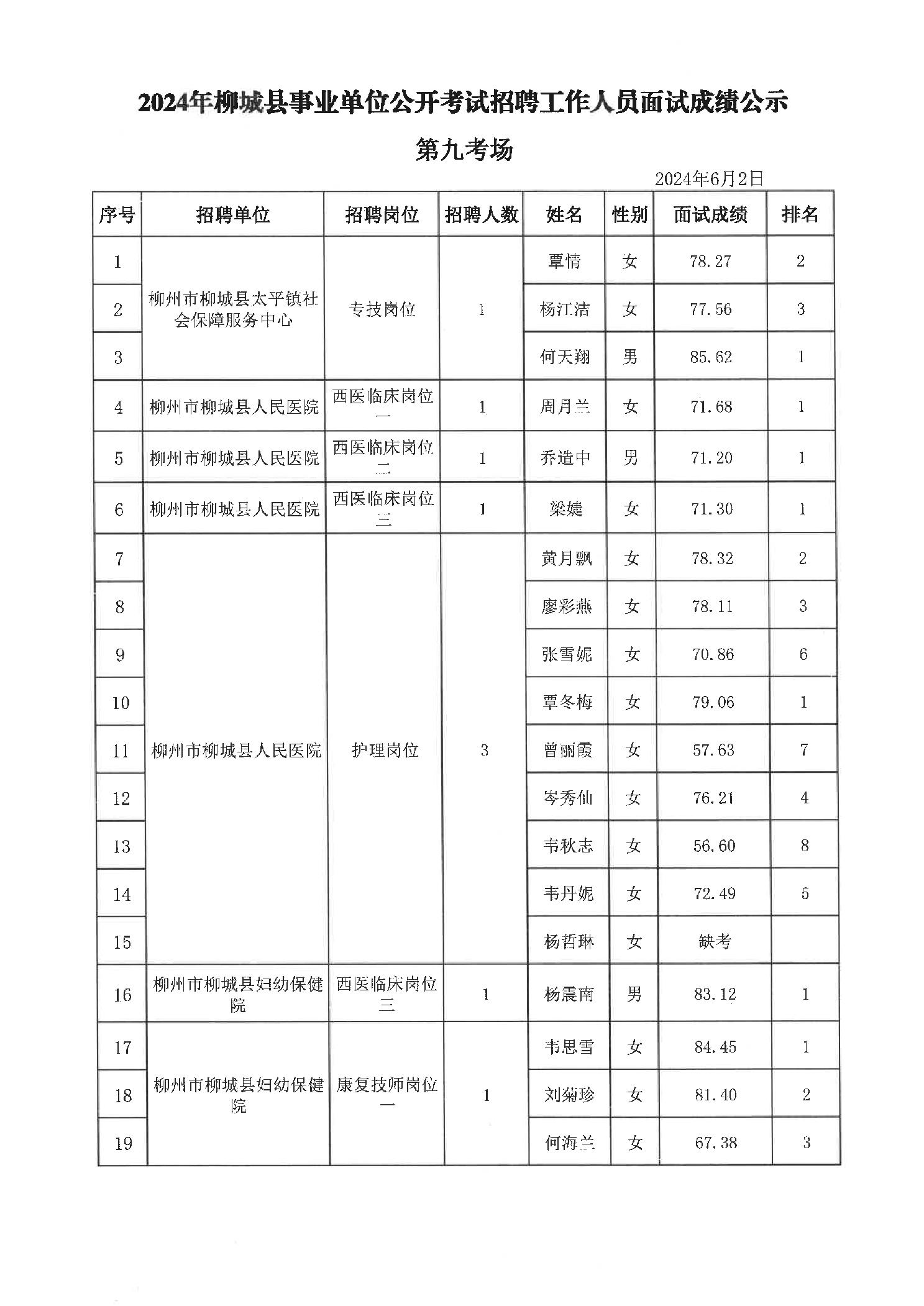 2024年柳城縣事業(yè)單位公開(kāi)考試招聘工作人員面試成績(jī)公示