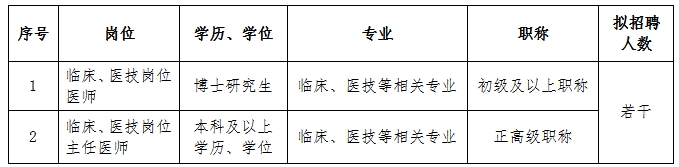 (二)臨床、醫(yī)技、護(hù)理等崗位人才(緊缺急需專業(yè):重癥醫(yī)學(xué)科、全科醫(yī)學(xué)科、康復(fù)醫(yī)學(xué)科、感染性疾病科、急診科、兒科、麻醉科、眼科、皮膚科、病理科、心腦電生理科等科室醫(yī)師)