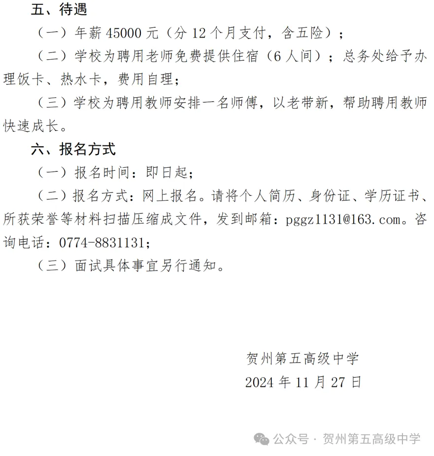 賀州第五高級(jí)中學(xué)2024年秋季學(xué)期招聘教師公告