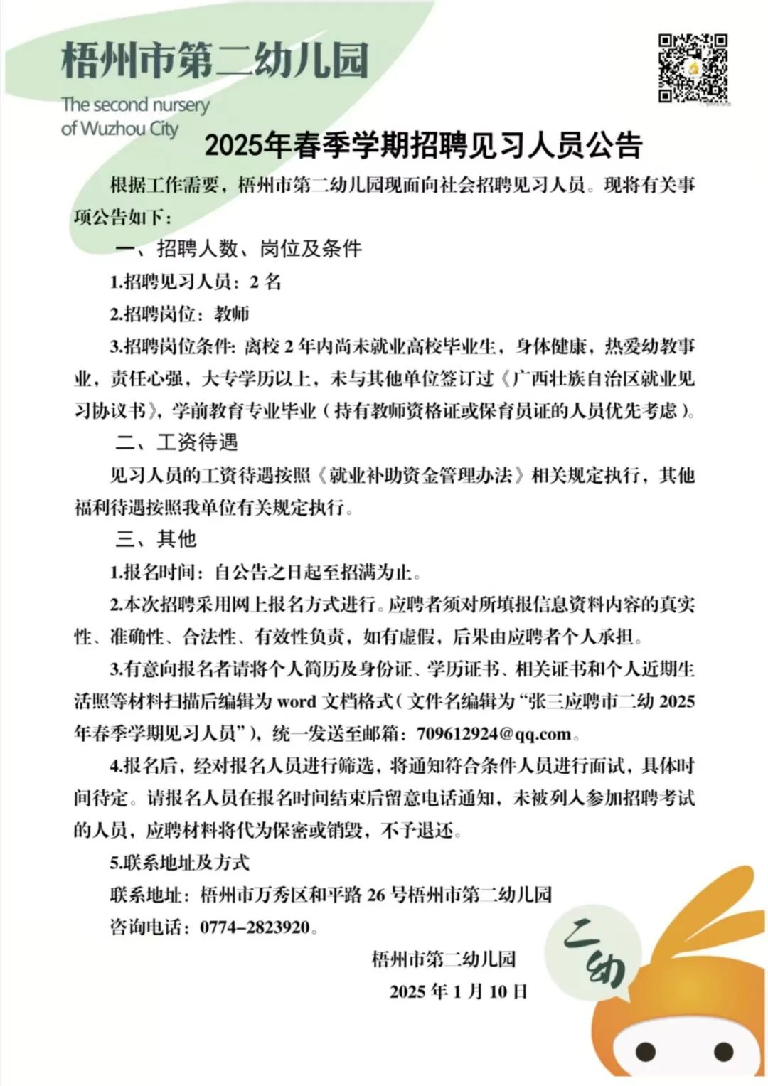 2025年梧州市第二幼兒園春季學(xué)期招聘見習(xí)人員公告