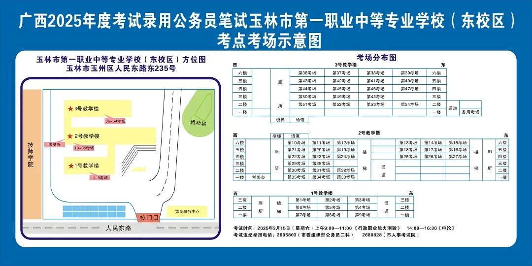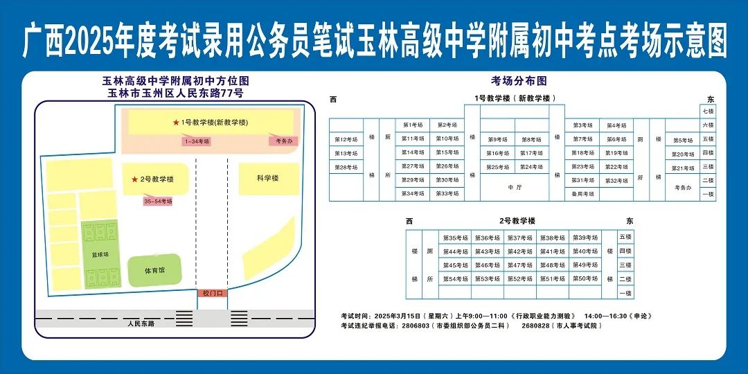 除考試當(dāng)天考生可以進入考點外,考生不得提前進入考點查看考場(學(xué)校將在大門處擺放考場分布示意圖),玉林考區(qū)11個考點的考場布置情況如下: