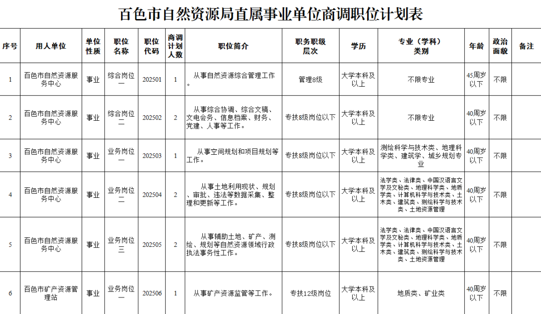 商調(diào)職位為百色市自然資源服務(wù)中心和百色市礦產(chǎn)資源管理站。具體職位信息詳見(jiàn)《百色市自然資源局直屬事業(yè)單位商調(diào)職位計(jì)劃表》。