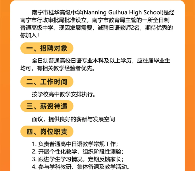 原文標(biāo)題:南寧市桂華高級中學(xué)面向社會(huì)公開招聘2名日語老師的公告