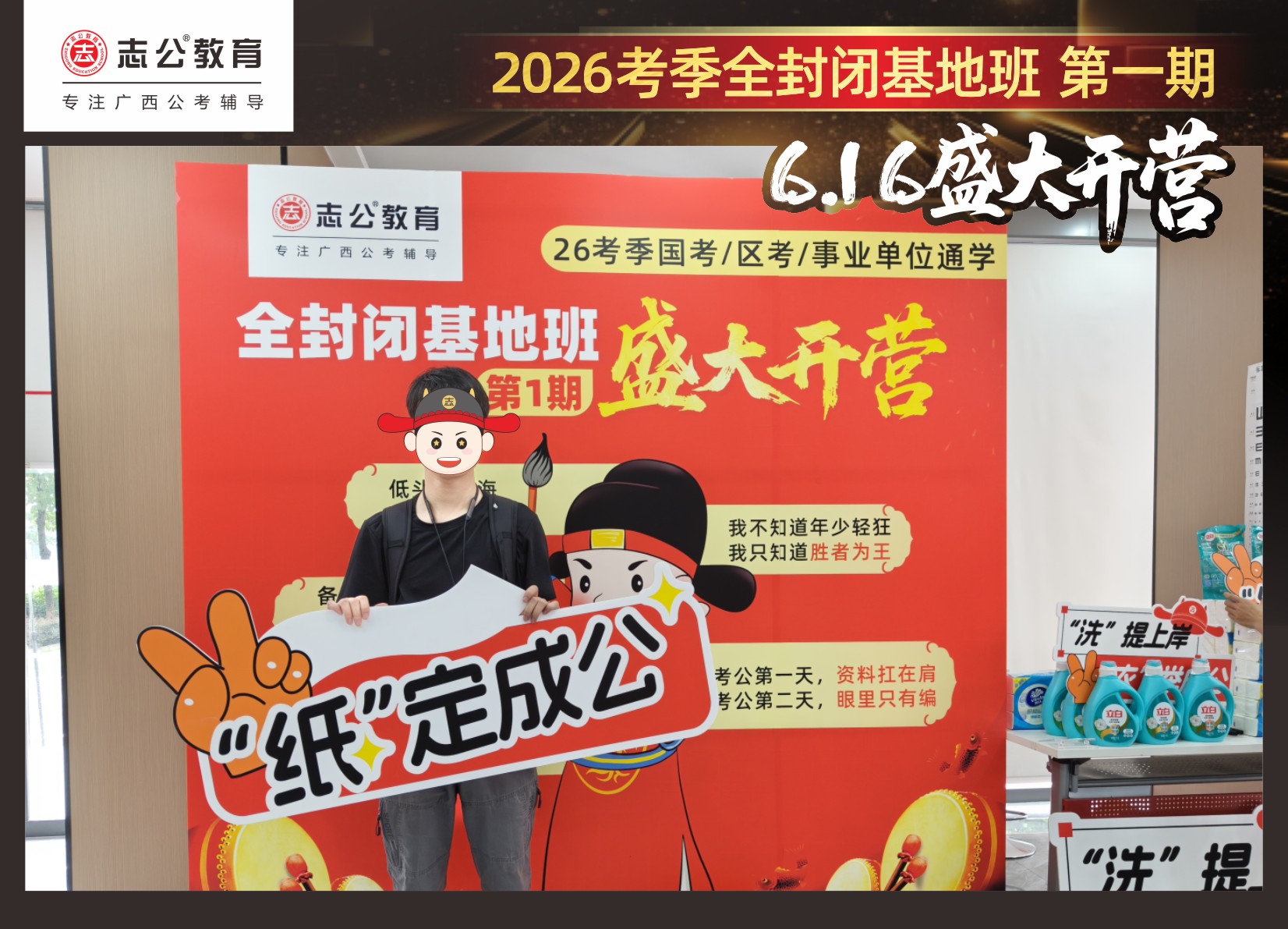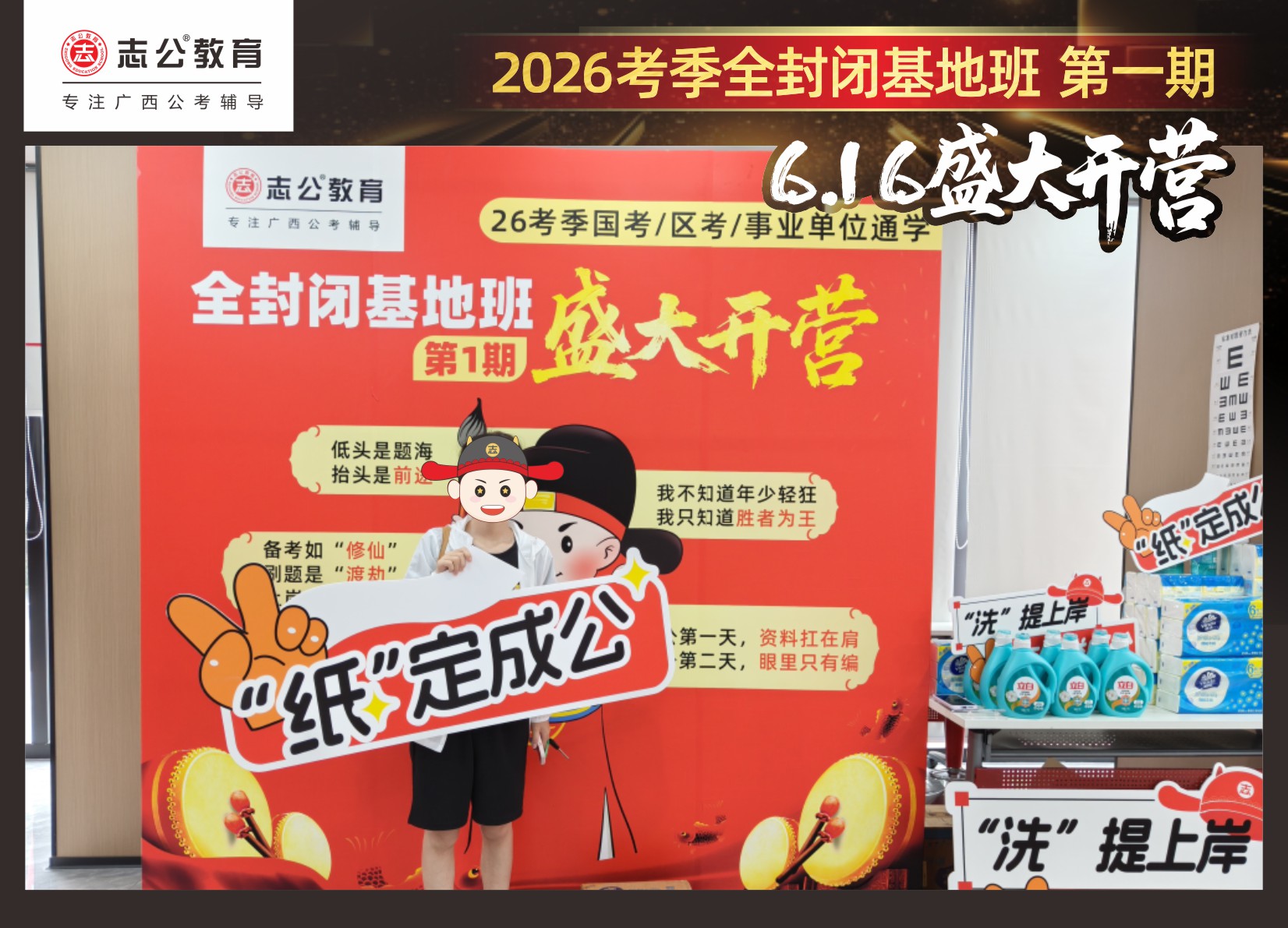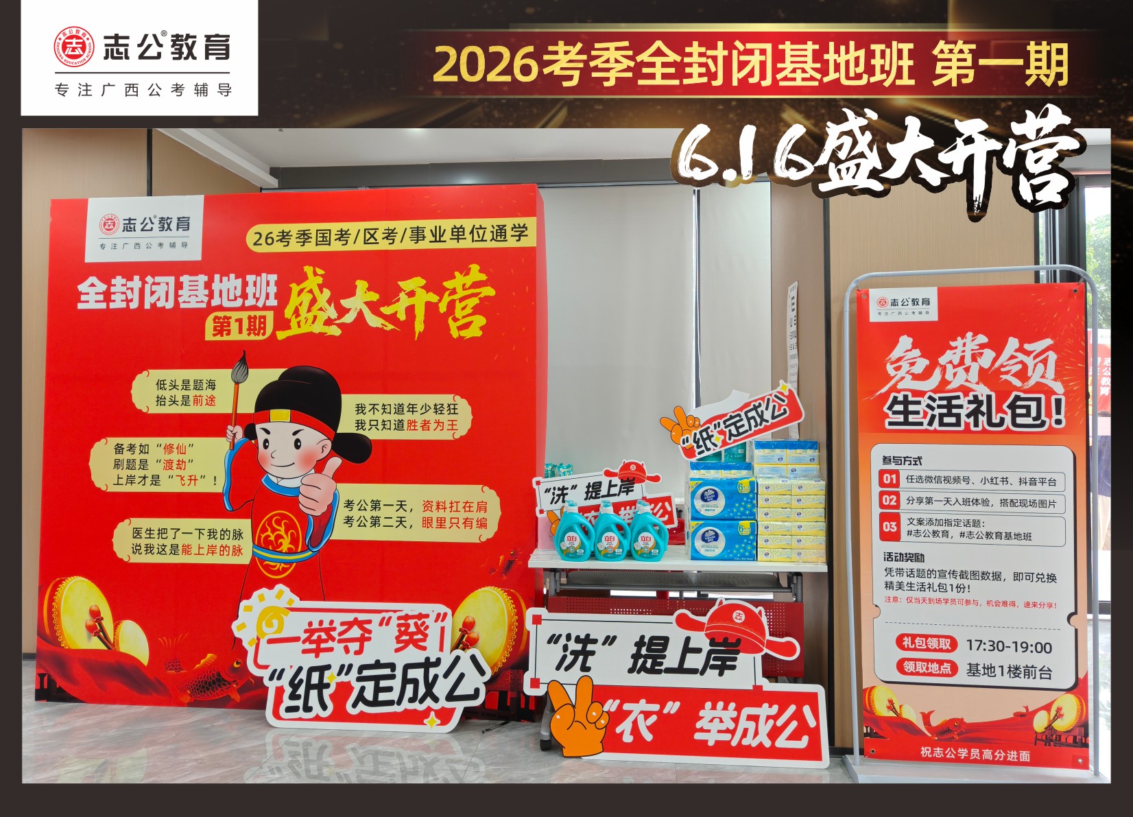 今天的開班還有一系列小活動噢~瞧!——“學員打卡活動”,所有今天到場的基地班學員,通過做一些小任務(wù)的方式,可以到前臺領(lǐng)取生活禮包即可領(lǐng)取生活禮品1份(一提六包的紙巾,或者一瓶洗衣液),這也是志公教育對所有學員的美好祝愿,預(yù)祝大家未來能夠“紙”定成公,“洗”提上/岸,“衣舉成公”!