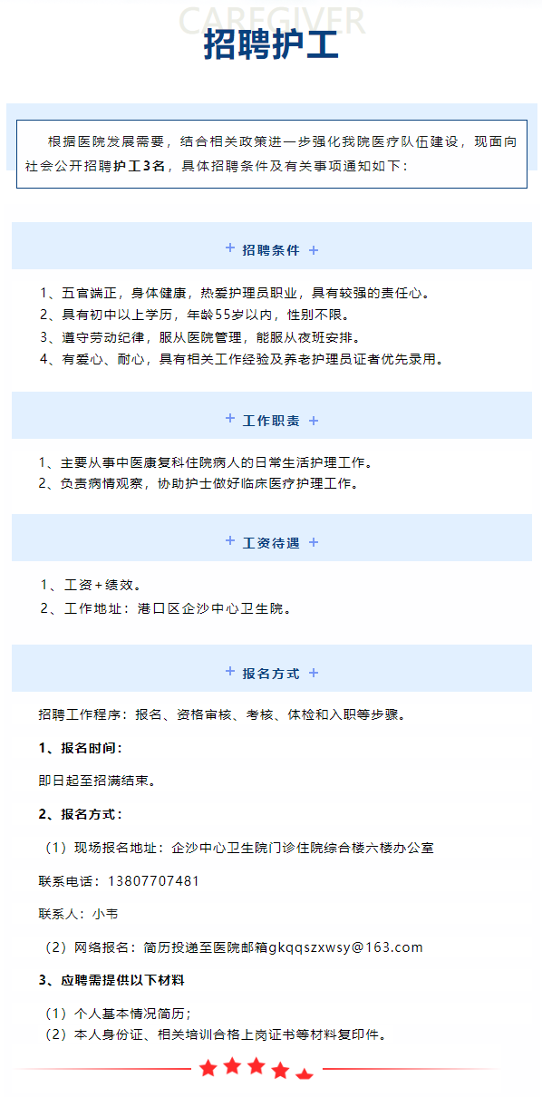 港口區(qū)企沙中心衛(wèi)生院招聘護(hù)工3人