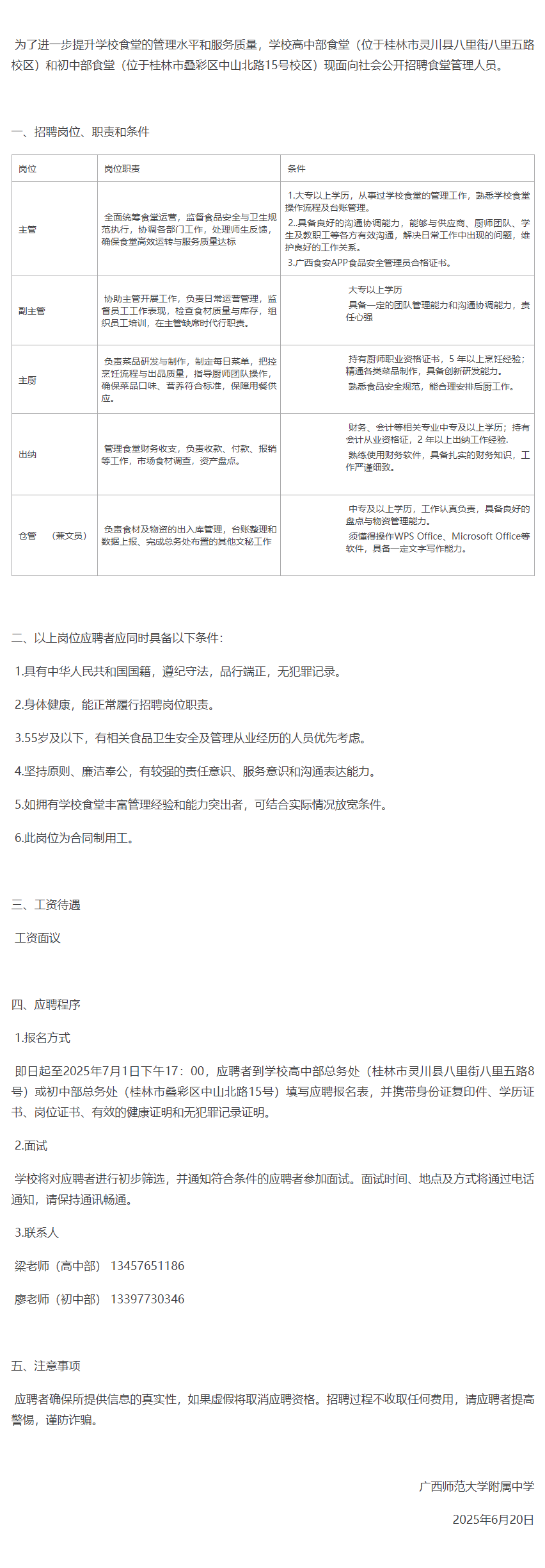 2025年廣西師范大學(xué)附屬中學(xué)食堂人員招聘公告