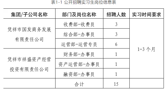 本次共計劃招聘憑祥市國際貿(mào)易開發(fā)集團有限公司下屬企業(yè)實習(xí)生崗位15人。具體要求詳見《附件1:憑祥市國際貿(mào)易開發(fā)集團有限公司2025年公開招聘暑期實習(xí)生崗位信息表》