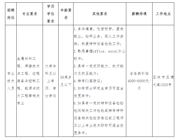 廣西壯族自治區(qū)特種設(shè)備檢驗(yàn)研究院玉林分院為廣西壯族自治區(qū)特種設(shè)備檢驗(yàn)研究院下屬分支機(jī)構(gòu),根據(jù)業(yè)務(wù)發(fā)展需要,現(xiàn)面向社會公開招聘編外聘用人員1名,崗位需求如下: