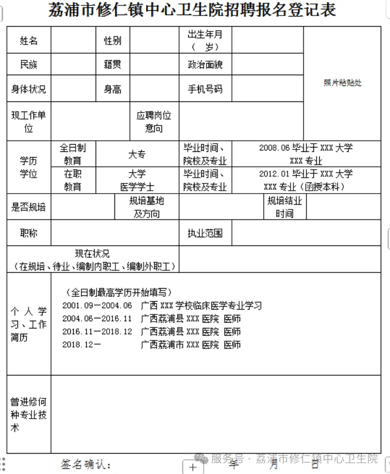 4.現(xiàn)場(chǎng)報(bào)名須知:請(qǐng)將簡(jiǎn)歷投遞至荔浦市修仁鎮(zhèn)建北街287號(hào),荔浦市修仁鎮(zhèn)中心衛(wèi)生院院辦公室。