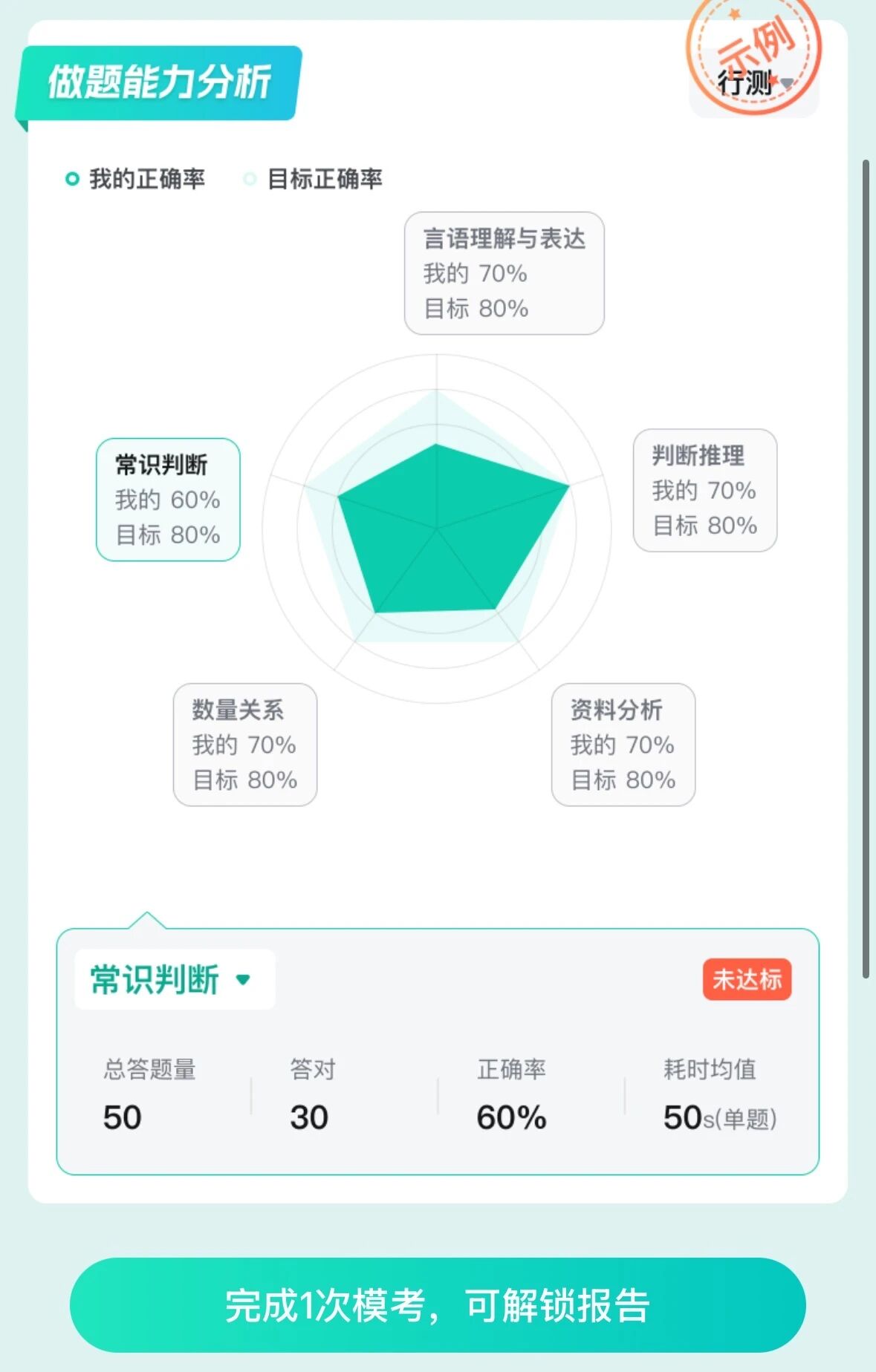 3??生成個(gè)人模考報(bào)告:考完就能查看??汲煽?jī)、排名及解析,生成的個(gè)人??紙?bào)告包含各模塊正確率分布、做題能力分析、筆試分?jǐn)?shù)yu測(cè)等內(nèi)容。