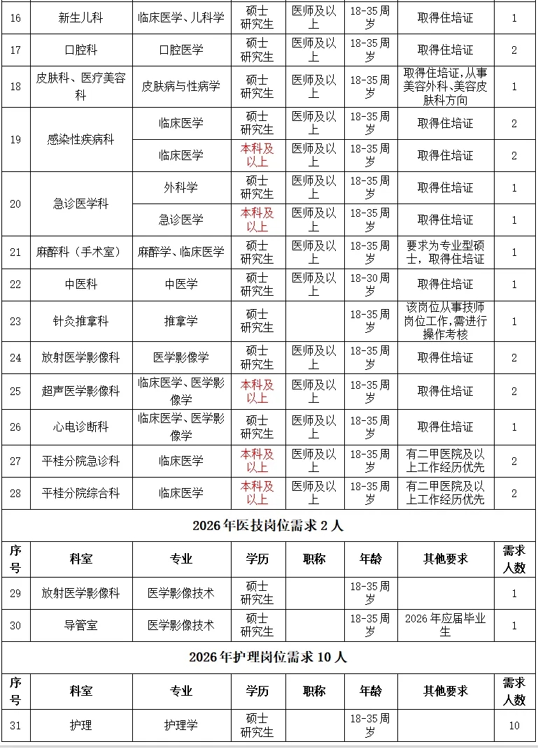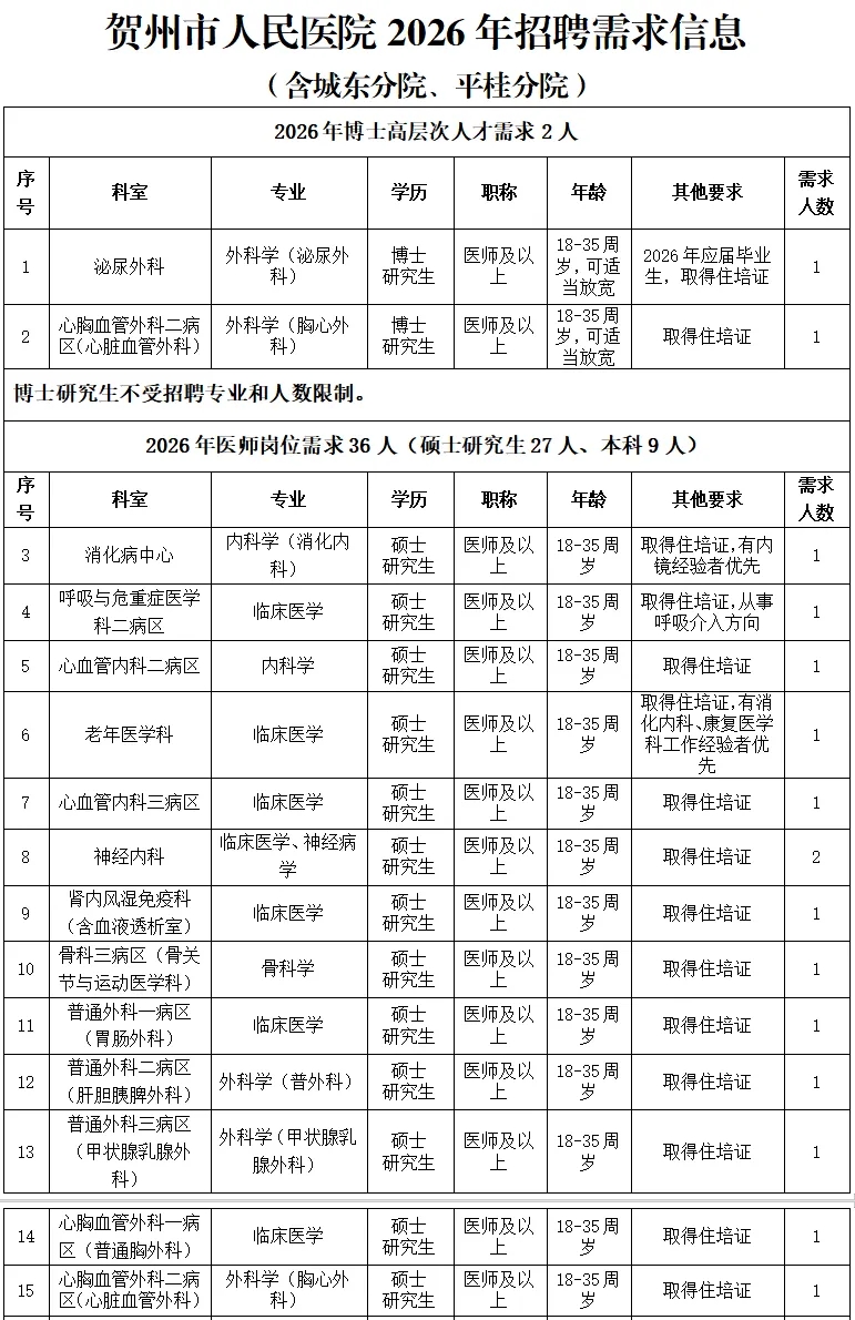 根據醫(yī)院發(fā)展規(guī)劃,招聘工作堅持公平公正公開,堅持德才兼?zhèn)?、人崗相適、擇優(yōu)錄取、雙向選擇的原則,2026年計劃引進博士、碩士高層次人才及招聘工作人員共計50名(詳見附件:賀州市人民醫(yī)院2026年招聘需求信息)。