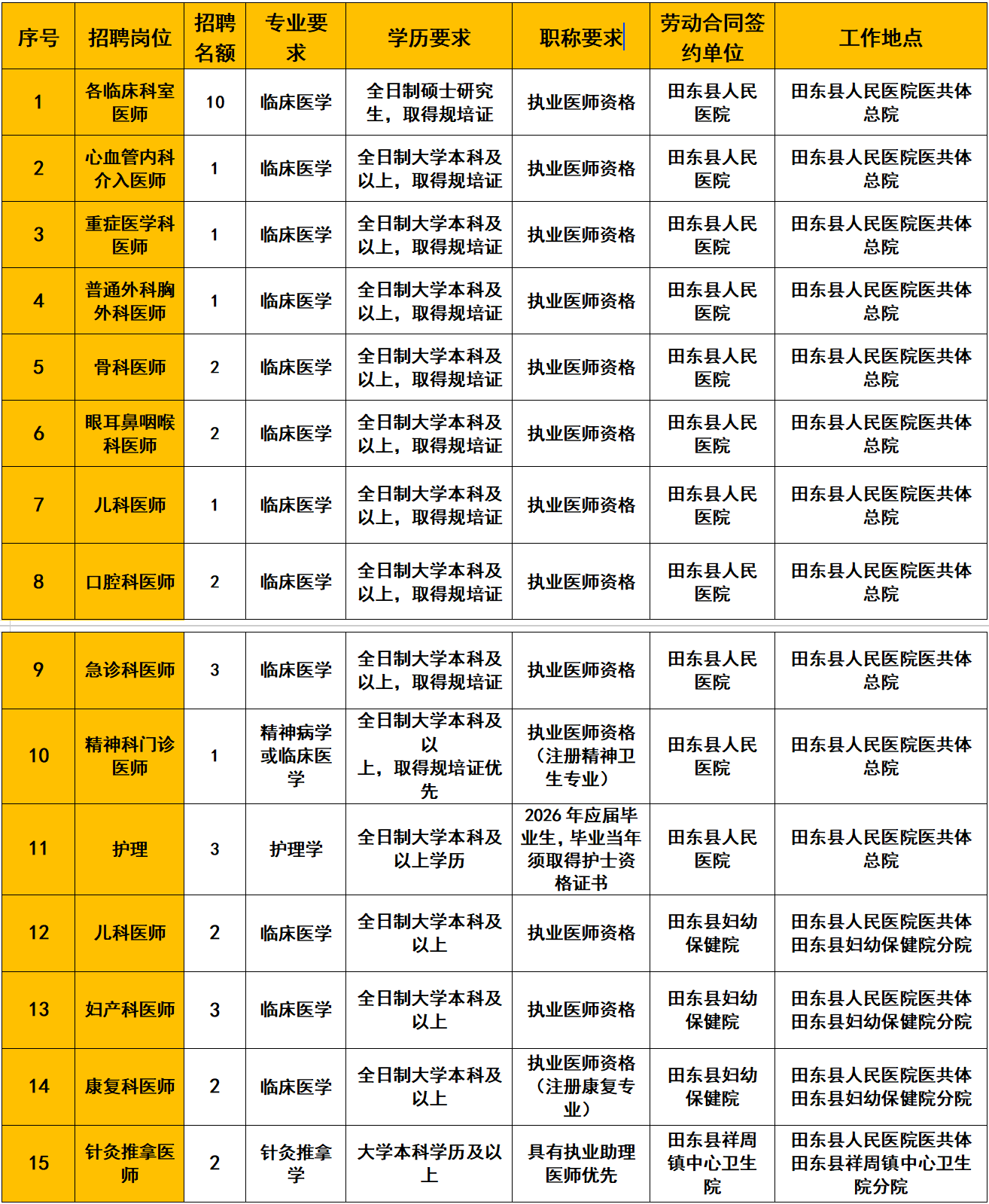 本次招聘是田東縣人民醫(yī)院醫(yī)共體總院根據(jù)總院、各分院的人才需求情況統(tǒng)一招聘,被錄用人員根據(jù)具體工作地點(diǎn)與相應(yīng)分院或總院簽訂勞動合同,被錄取人員的薪酬、福利待遇由相應(yīng)的分院或總院按同類型人員發(fā)放。具體招聘崗位詳見附件:《2026年田東縣人民醫(yī)院醫(yī)共體