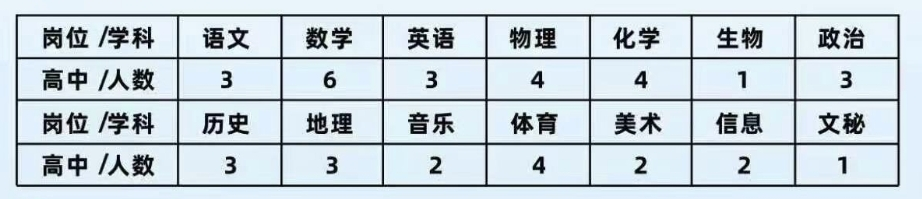 學(xué)校于2023年9月1日正式開學(xué),現(xiàn)有30個(gè)行政班,一千余名學(xué)生,專任教師128人,發(fā)展勢頭強(qiáng)勁。為適應(yīng)學(xué)校未來發(fā)展需要,特面向全國師范類畢業(yè)生擇優(yōu)招聘青年教師若干,詳情如下: