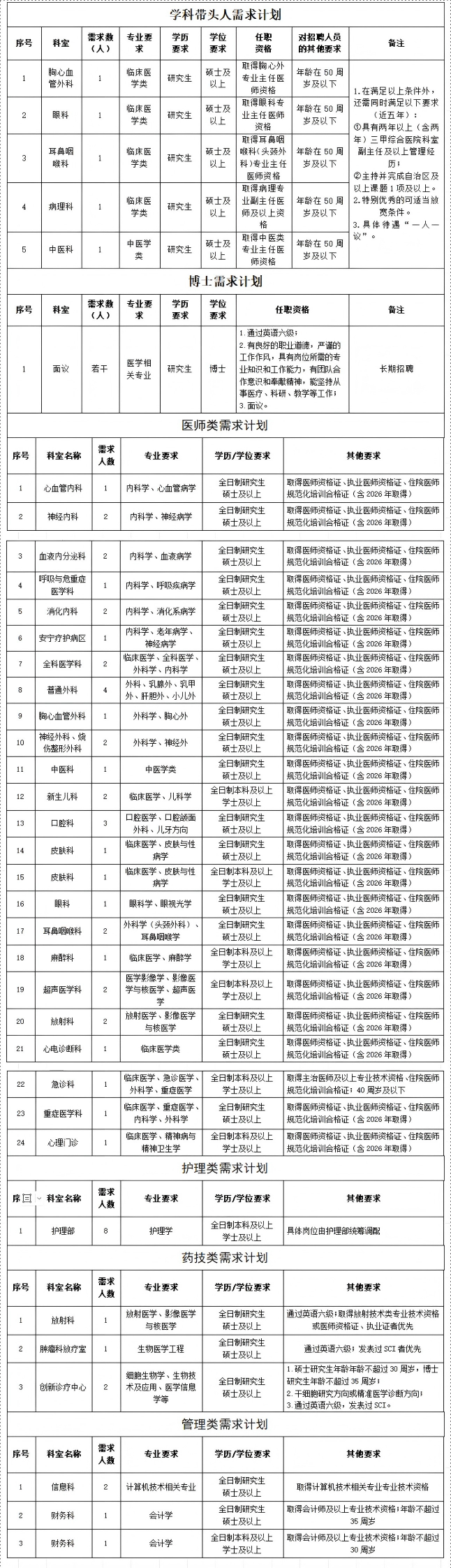 為進(jìn)一步完善現(xiàn)有人才隊(duì)伍,促進(jìn)醫(yī)院學(xué)科發(fā)展,提升醫(yī)院綜合實(shí)力,因業(yè)務(wù)發(fā)展需要,現(xiàn)面向社會進(jìn)行公開招聘,具體招聘崗位如下: