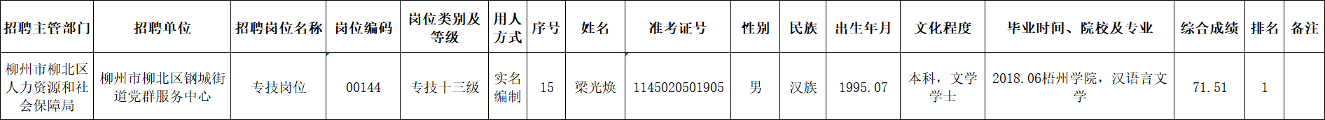 根據(jù)《柳州市2025年度下半年事業(yè)單位公開考試招聘工作人員公告》要求及安排,梁光煥同志經(jīng)面試、考察、體檢合格,符合聘用條件。經(jīng)研究決定,擬聘用梁光煥同志為我區(qū)事業(yè)單位工作人員,現(xiàn)予以公示,公示期為5個(gè)工作日(2026年1月22日至2026年1月28日)。對擬聘用的同志如有異議,請以書面形式,并署真實(shí)姓名和聯(lián)系地址,于2026年1月28日前郵寄或直接送我單位(地址:柳州市勝利路12-8號(hào)柳北區(qū)政府4樓417室;郵編:545002,電話0772-2513360),群眾如實(shí)反映有關(guān)問題受法律保護(hù)。