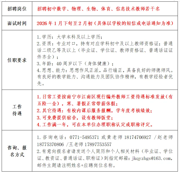 原文標(biāo)題:南寧經(jīng)濟(jì)技術(shù)開發(fā)區(qū)第一初級中學(xué)2026年春季學(xué)期教師招聘公告