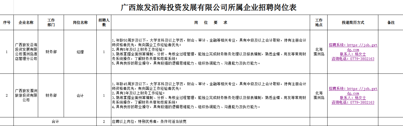 廣旅沿海投資公司所屬企業(yè)有關崗位員工2人。